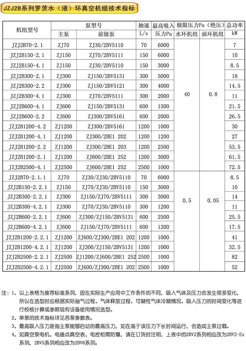 更寬,但其所消耗的功率也更大。如果能確認被抽系統的工作壓力<2000Pa時,應優先選用JZJ2B300 -4.1機組