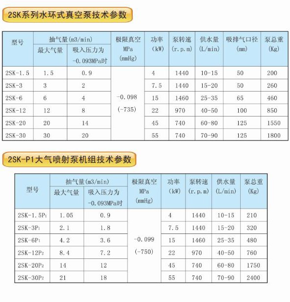 2SK系列適用于吸入壓力低于-0. 08MPa的工況條件。2SK P1系列適用于吸入低于-0. 096Mpa的工況條件,在配用大氣泵時,極限真空度可達-750mmHg。工作真空范圍為-0. 03-0. 085MPa。