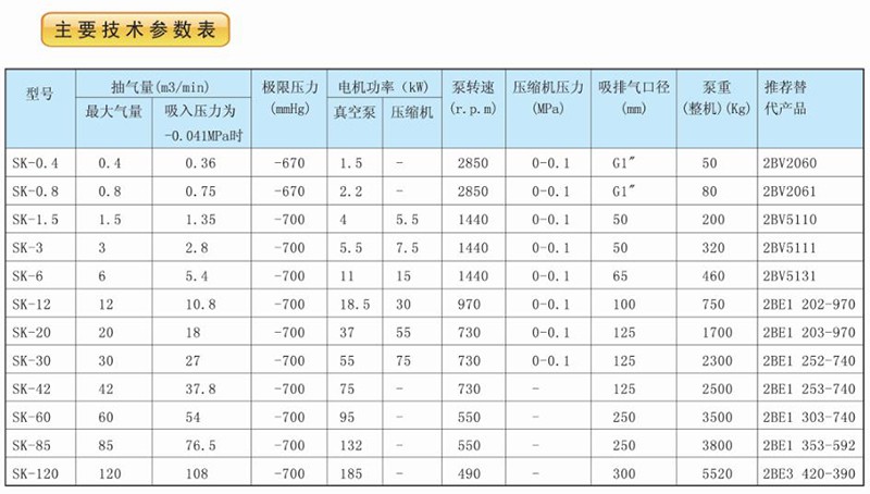 SK系列水環(huán)式真空泵及壓縮機(jī)被廣泛應(yīng)用于機(jī)械、石油化工、制藥、食品、制糖工業(yè)及電子領(lǐng)域。由于在工作過(guò)程中氣體的壓縮過(guò)程是等溫的,所以在壓縮和抽吸易爆炸氣體時(shí),不易發(fā)生危險(xiǎn),所以其應(yīng)用更加廣泛。作為80年代的水環(huán)真空泵技術(shù),SK系列水環(huán)泵目前雖仍有用戶在使用,但因其效率低,性能差,將逐漸被2BV、2BE1 系列節(jié)能水環(huán)泵所取代。